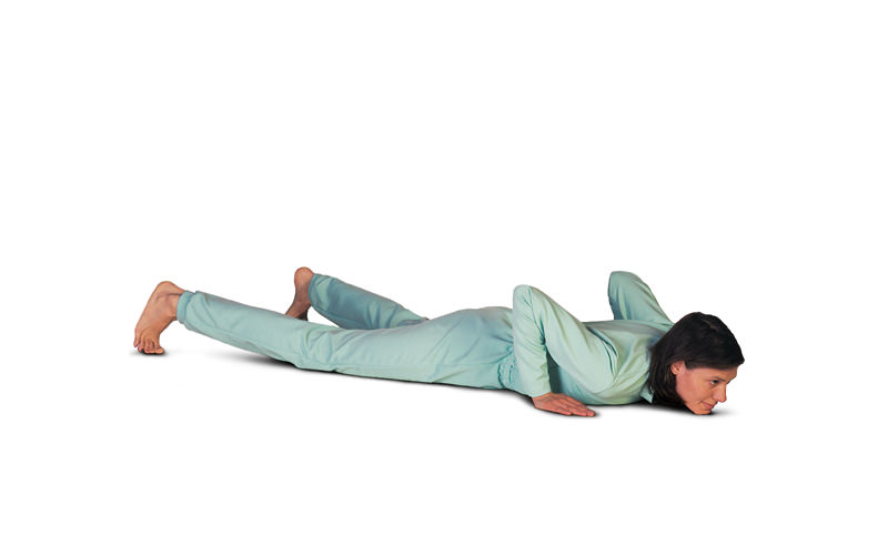 Lie on the abdomen and place the hands beside the shoulders on the floor. Legs are slightly apart with toes tucked under. >Inhaling press the hips to the floor. Raise the upper body with the help of the arms. >Look up. >Exhaling slowly turn the head and upper body to the right and look over the right shoulder towards the left heel. >Inhaling turn back to the centre again and look upwards. >Exhaling slowly return to the starting position.